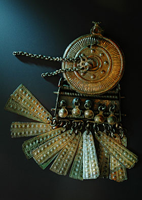 Symbolický význam měl i antropomorfní prvek uplatněný ve střední části spony, kde jsou jako závěsky připojeny zdobené plechové oboustranné pukličky připomínající ňadra.